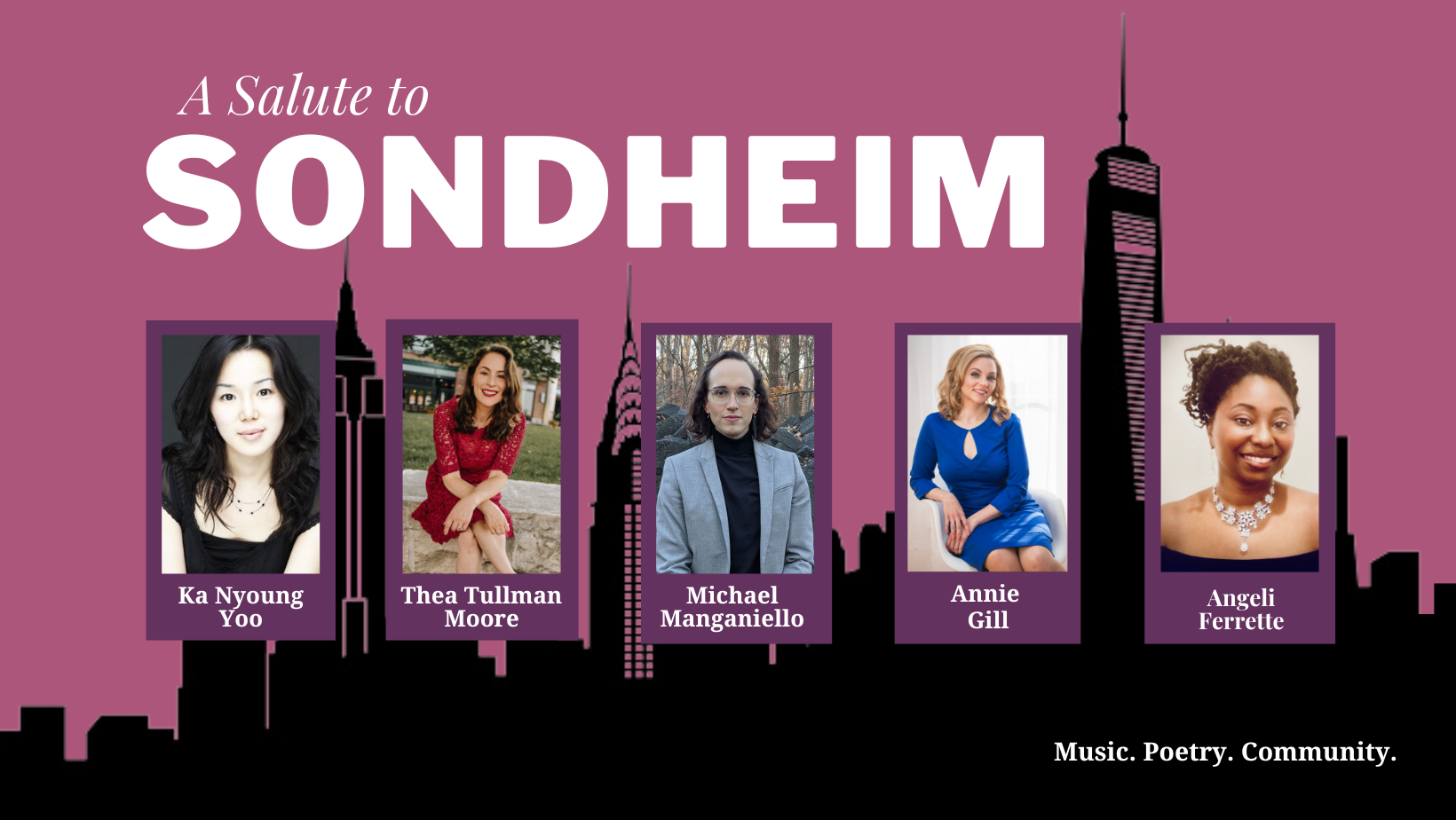 Join us for a tribute to legendary composer and lyricist Stephen Sondheim. Hear some of his most beloved songs plus lesser known gems and works by artists who mentored and inspired him, including Rodgers & Hammerstein, Leonard Bernstein, Jerome Kern, and Harold Arlen. Songs from Into the Woods, Porgy and Bess, West Side Story, Company, The King and I, Merrily We Roll Along, Sweeney Todd, and more will be performed by Angeli Ferrette, Annie Gill, Michael Manganiello, Thea Tullman Moore, and pianist Ka Nyoung Yoo. The artists will also share incredible stories about Sondheim's life and rise to fame.