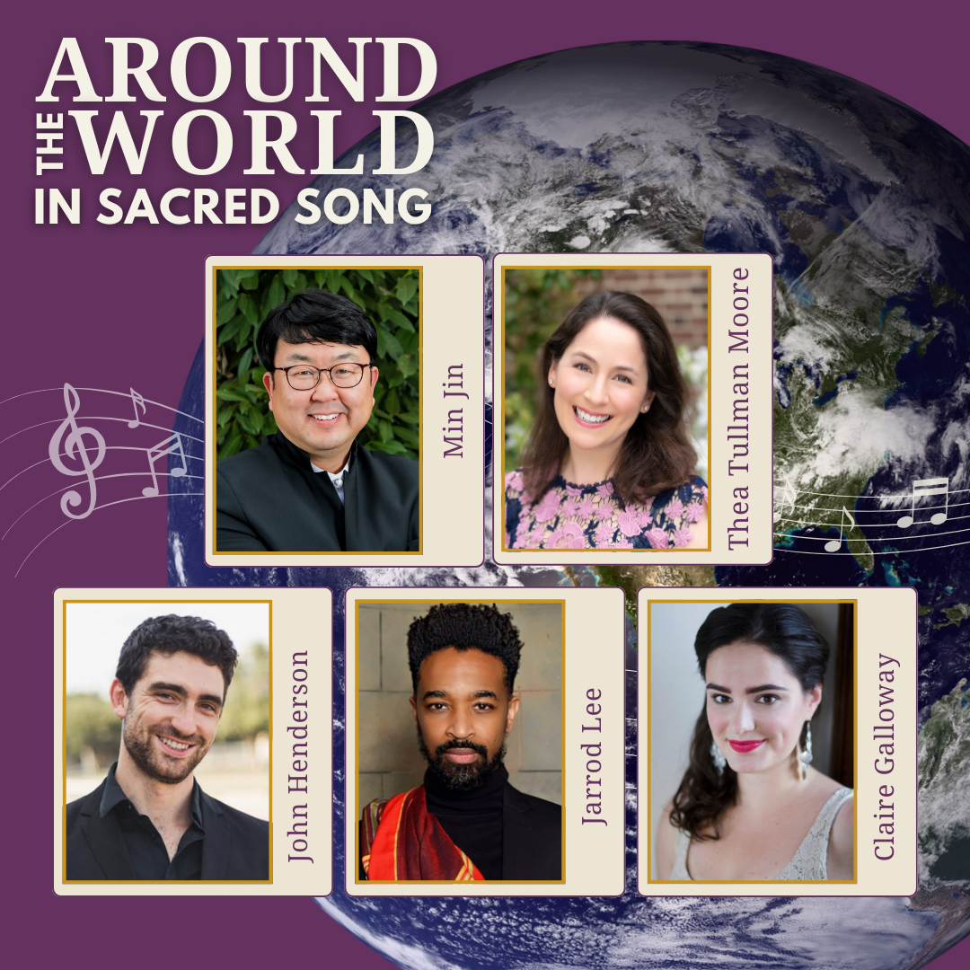 This multi-faith journey includes songs, duets, and ensembles by Georges Bizet, Moses Hogan, Felix Mendelssohn, César Franck, John Harbison, Andrew Lloyd Webber, Debbie Friedman, Max Helfman, Ben Steinberg, and more performed by Min Jin, Jarrod Lee, Claire Galloway, Thea Tullman Moore, and pianist John Henderson. Hear stunning arrangements of beloved hymns and sacred texts, prayers for healing, spirituals, rousing texts by a 16th century Hindu poetess, Korean worship music, and Jewish folk songs. The program will be followed by a reception—the perfect opportunity to meet the artists and fellow music lovers in the community.