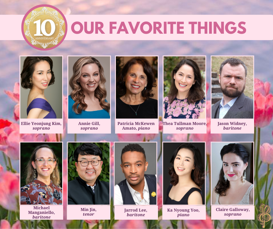 Join us for our 10th birthday celebration and a Greatest Hits program of musical theater tunes by Rodgers & Hammerstein, Irving Berlin, and Kurt Weill; art songs by Ralph Vaughan Williams, Samuel Barber, Libby Larsen, Jean Sibelius, and more, plus favorite operatic moments from Verdi’s La traviata and Bizet’s Carmen. Featured artists include Thea Tullman Moore, Annie Gill, Claire Galloway, Min Jin, Michael Manganiello, Jason Widney, Ellie Yeonjung Kim, Jarrod Lee, Ka Nyoung Yoo, and Patricia McKewen Amato. Come dressed in festive attire from your favorite decade and enjoy an afternoon of music, poetry, raffles, sing-alongs, Musicales trivia, and more!